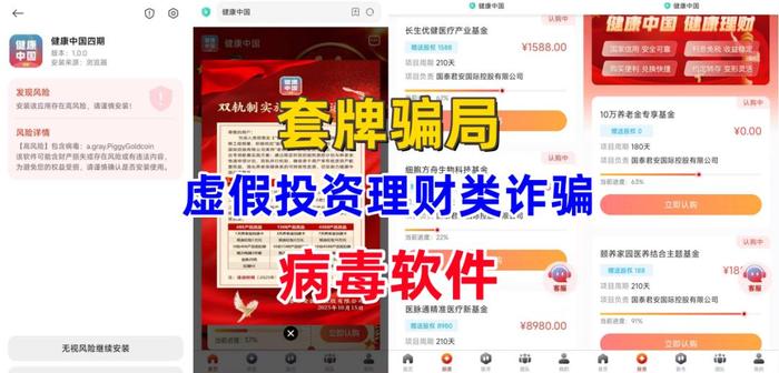 虛假投資理財。不法分子冒充“國泰君安”公司的名義,打著“人人持幣,共同富?!钡钠焯枺谱魃⒉忌嬖pAPP,虛構推廣“10萬養(yǎng)老金專享基金”“頤養(yǎng)家園醫(yī)養(yǎng)結合主題基金”“健源生物醫(yī)藥成長基金”“長生優(yōu)健醫(yī)療產業(yè)基金”“細胞方舟生物科技基金”等高額返利理財項目實施詐騙。