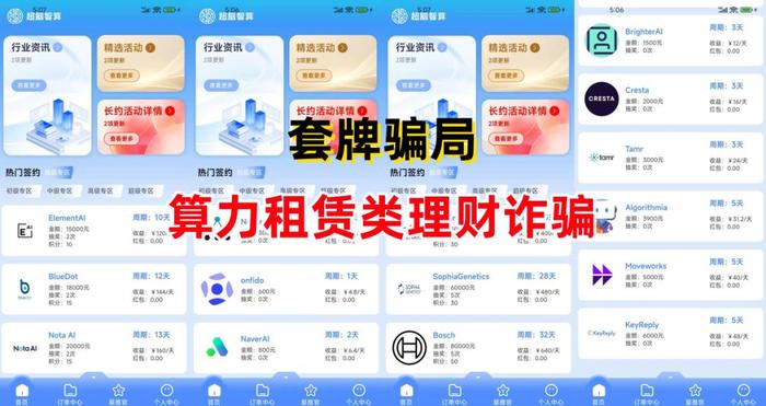 算力租賃類騙局。不法分子冒充香港某公司的名義,制作散布涉詐APP,打著算力租賃的旗號,虛構(gòu)推廣“ElementAl”“BlueDot”“Numenta”“NaverAl”等高額返利理財項目。