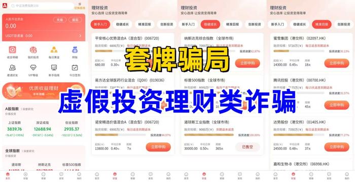 冒牌的虛假理財詐騙。不法分子冒充境外合格投資者“艾克投資”公司的名義,制作散布涉詐APP,虛構(gòu)推廣“平安核心優(yōu)勢混合A”“易方達全球醫(yī)藥行業(yè)混合”“標普500指數(shù)”“納斯達克綜合指數(shù)”“道瓊斯工業(yè)指數(shù)”等每日返息到期返本高額返利理財項目。