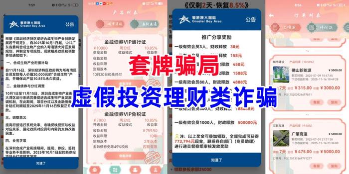 冒牌的虛假理財詐騙。不法分子冒充“粵港澳大灣區(qū)辦公室”的名義,制作散布涉詐APP,虛構(gòu)推廣“通行證”“免稅證”“深圳地鐵”“灣區(qū)金愿”等周收益率高達10%以上高額返利理財項目。