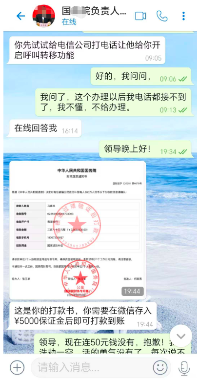 讓王大爺始料未及的是,騙局并未止步。一名自稱“國務(wù)院負(fù)責(zé)人張玉卓”的人聯(lián)系他,聲稱可辦理退款,但要求先轉(zhuǎn)5000元微信保證金、郵寄手機(jī)卡。這種“賊喊捉賊”的要求讓王大爺警醒,果斷拒絕。
