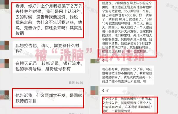 網(wǎng)友在網(wǎng)上被陌生好友以“介紹工作”為由騙至臨桂地區(qū),隨后每天被不同的人輪番“洗腦”。對方不斷向其灌輸“西部大開發(fā)”等國家政策,并宣稱投資33500元5個月即可回本,出局可賺1200萬元。