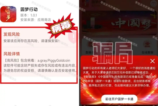 虛構(gòu)的“益慈善”APP:聲稱發(fā)放6000億慈善幫扶金,非法搜集信息。 虛構(gòu)的“圓夢(mèng)行動(dòng)”APP:冒充國(guó)家部門(mén),以“338萬(wàn)補(bǔ)償款”為誘餌,誘導(dǎo)參與者填寫(xiě)個(gè)人信息領(lǐng)取120萬(wàn)補(bǔ)償款,繳納費(fèi)用成為“圓夢(mèng)大使”還可再領(lǐng)取120萬(wàn)大使獎(jiǎng)金。下載提示未備案且攜帶病毒。