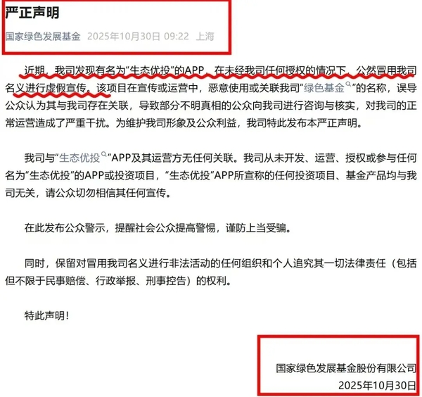 虛構(gòu)的“生態(tài)優(yōu)投”APP:冒充“國(guó)家綠色基金”兜售虛假投資理財(cái)實(shí)施詐騙。10月30日,國(guó)家綠色發(fā)展基金發(fā)布嚴(yán)正聲明,證明“生態(tài)優(yōu)投”APP及其運(yùn)營(yíng)方與其無(wú)任何關(guān)聯(lián)?!秶?yán)正聲明》