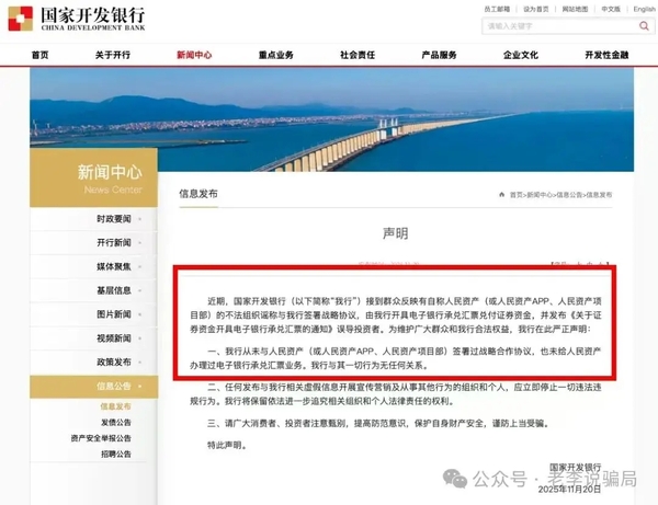 虛構(gòu)的“人民資產(chǎn)”APP:國(guó)家開(kāi)發(fā)銀行(國(guó)開(kāi)行)發(fā)布聲明,從未與人民資產(chǎn)(或人民資產(chǎn)APP、人民資產(chǎn)項(xiàng)目部)簽署過(guò)戰(zhàn)略合作協(xié)議,也未給人民資產(chǎn)辦理過(guò)電子銀行承兌匯票業(yè)務(wù)。