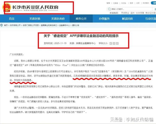 11月19日,長沙市芙蓉區(qū)人民政府發(fā)布公告,提示該項(xiàng)目具有傳銷、詐騙、非法集資等行為特征,存在較大風(fēng)險(xiǎn),已被監(jiān)管部門責(zé)令關(guān)門停業(yè)。