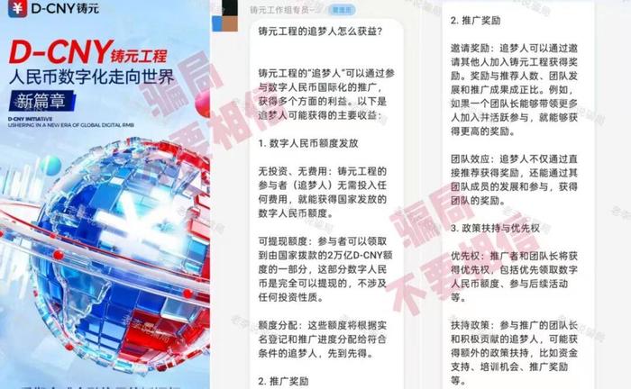 打著“推廣數(shù)字人民幣”的旗號(hào),套取用戶個(gè)人信息,利用推廣獎(jiǎng)勵(lì)擴(kuò)張團(tuán)隊(duì),達(dá)到詐騙目的。