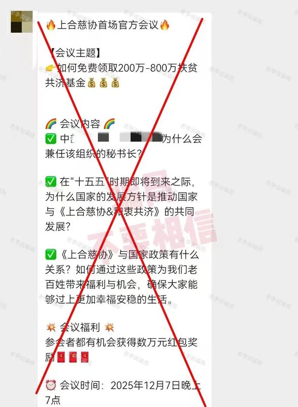 碰瓷“上合組織”,打著“上合慈協(xié)”名義,以免費(fèi)領(lǐng)取所謂的“200-800萬扶貧共濟(jì)基金”為誘餌吸引參與者加入,達(dá)到詐騙目的。
