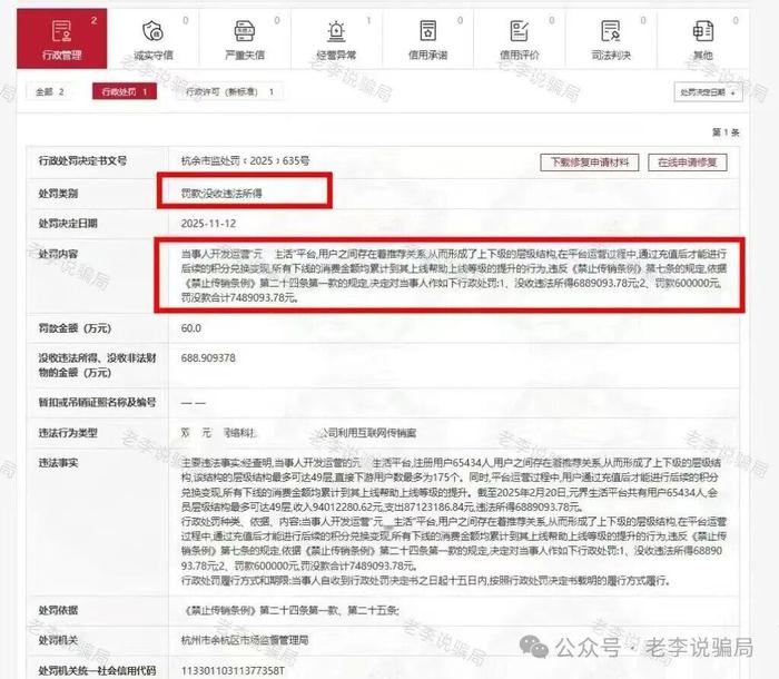 11月12日,杭州市余杭區(qū)市場(chǎng)監(jiān)督管理局經(jīng)調(diào)查發(fā)現(xiàn),該平臺(tái)開發(fā)的“元某生活”APP,用戶之間形成上下層級(jí)關(guān)系多達(dá)49層,充值才能進(jìn)行后續(xù)積分兌換變現(xiàn),所有下線消費(fèi)金額均累計(jì)到其上線幫助上線等級(jí)的提升,違反《禁止傳銷條例》,因此做出罰款沒收違法所得的行政處罰。