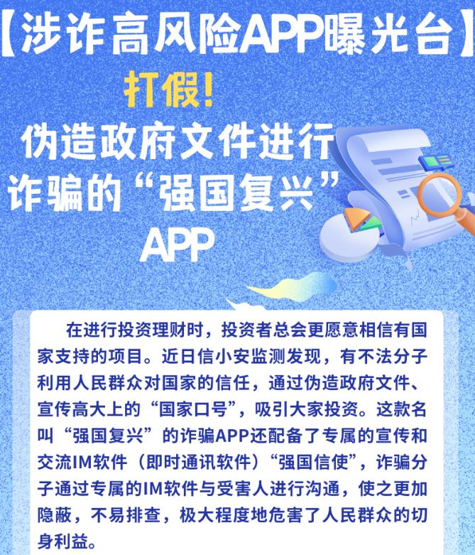 早在2024年6月,信息通信行業(yè)反詐中心,就發(fā)文《打假!偽造政府文件進(jìn)行詐騙的“強(qiáng)國復(fù)興”APP》提示廣大網(wǎng)友“強(qiáng)國復(fù)興”是詐騙軟件,可現(xiàn)如今,還有人癡迷其中。