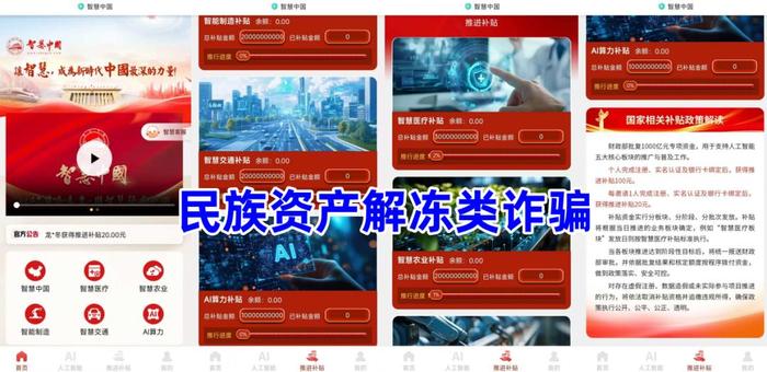 民族資產(chǎn)解凍類詐騙。不法分子冒充某部門的名義,打著推廣“智慧普及”的旗號,聲稱批復(fù)1000億元專項(xiàng)資金,用于提高公眾對人工智能技術(shù)的認(rèn)知與應(yīng)用能力,要求參與者實(shí)名注冊,每天分享“家國同行”分享即可領(lǐng)取“AI算力補(bǔ)貼”“智慧交通補(bǔ)貼”“智能制造補(bǔ)貼”等獎勵。