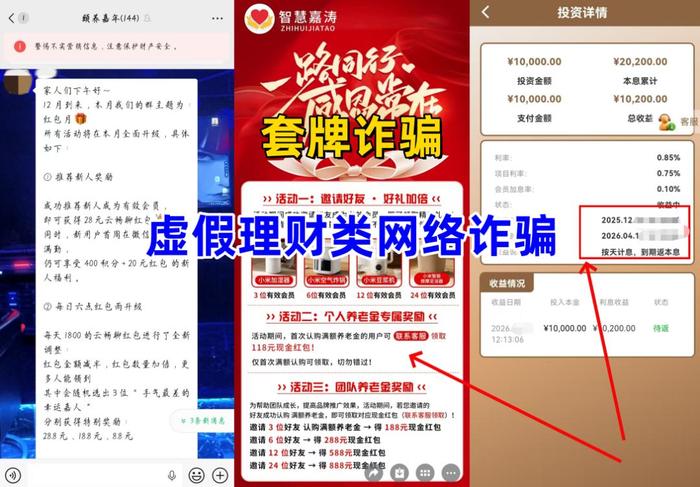 虛假理財(cái)詐騙。不法分子冒充某公司的名義,打著“養(yǎng)老理財(cái)”的旗號,虛構(gòu)推廣日收益率1%以上高額返利理財(cái)項(xiàng)目。