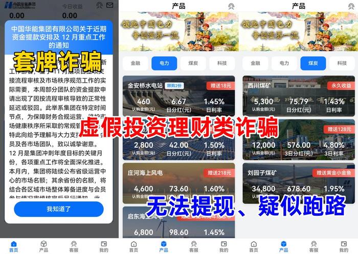不法分子冒充“中國華能”公司的名義,制作散布涉詐APP,虛構(gòu)推廣“金融”“電力”“煤炭”“科技”等高額返利理財(cái)項(xiàng)目。