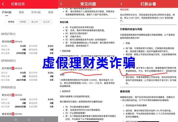 金融投資(打新股)。不法分子冒充境外某投資公司的名義,打著“高中標(biāo)率”“高額回報(bào)”等旗號,制作散布涉詐APP,虛構(gòu)推廣高額返利理財(cái)項(xiàng)目實(shí)施詐騙。