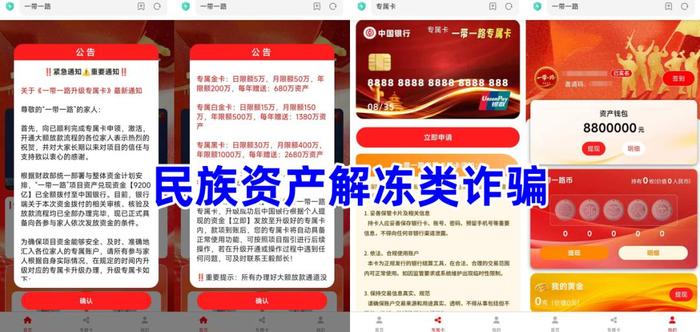民族資產(chǎn)解凍類詐騙。不法分子冒充某部門的旗號,打著“一帶一路”兌現(xiàn)的旗號,聲稱發(fā)放“9200億元”專屬資金,要求參與者實(shí)名注冊,即可獲得880萬元的現(xiàn)金,提現(xiàn)需要辦理專屬銀行卡。