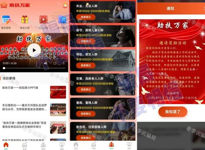 謊稱“國家項目”,以“幫扶”名義吸引參與者,針對社會上各種類型的“困難群眾”,設(shè)置不同金額的“助扶津貼”,完全符合“困難人群”當下急于解困的心理,屬于非常有針對性的騙局。