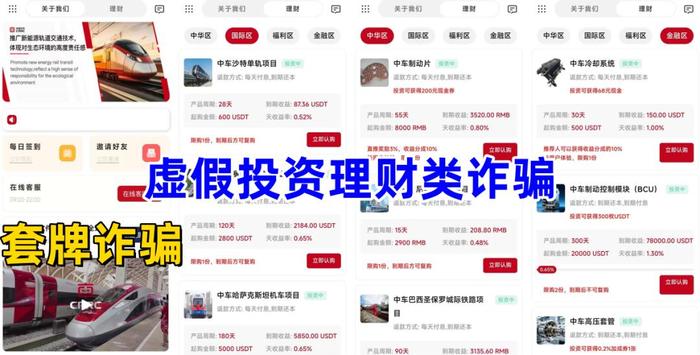 虛假理財(cái)詐騙。不法分子冒充“中國(guó)中車”公司的名義,制作散布涉詐APP,虛構(gòu)推廣“中車制動(dòng)片”“中車印尼電動(dòng)車組項(xiàng)目”“中車?yán)鋮s系統(tǒng)”“中車高壓套管”等高額返利理財(cái)項(xiàng)目。