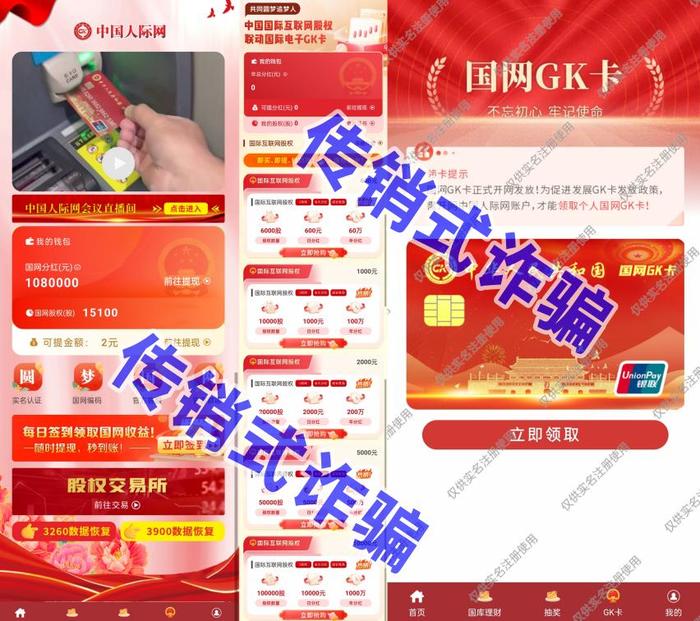 傳銷式詐騙。不法分子打著“IPV9”“國(guó)網(wǎng)GK”卡的旗號(hào),制作散布涉詐APP,虛構(gòu)推廣“國(guó)際互聯(lián)網(wǎng)股權(quán)”“國(guó)庫(kù)理財(cái)養(yǎng)老”等高額返利理財(cái)項(xiàng)目。