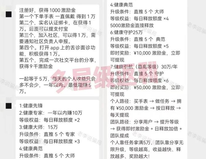 項目將一款號稱可檢測健康的手表作為產(chǎn)品,宣稱每日佩戴并完成實名注冊、加入社區(qū)、參與面診、分享平臺等任務,即可獲得5萬元收益。并根據(jù)推薦人數(shù)劃分等級, 并根據(jù)等級發(fā)放激勵金和相應的每日釋放額度。
