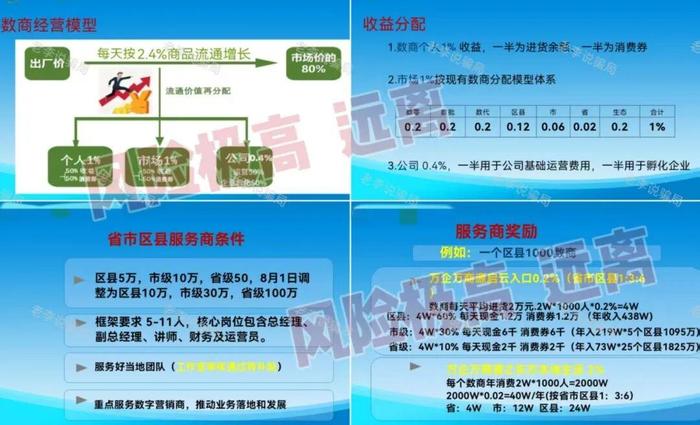 但是,該項(xiàng)目宣稱的年化回報(bào)遠(yuǎn)超常規(guī)商業(yè)項(xiàng)目合理范圍,且收益按層級(jí)、行政區(qū)劃層級(jí)逐級(jí)拆分,服務(wù)商收益依賴下屬團(tuán)隊(duì)規(guī)模及投入,且需繳納高額門檻費(fèi),模式并不合規(guī)。