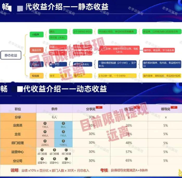 宣稱無(wú)需投資,用戶通過(guò)觀看小程序廣告、短劇、短視頻等內(nèi)容獲取收益。但在收益模式方面,采用“二八分賬”(個(gè)人80%、平臺(tái)20%),除單日觀看2小時(shí)可獲40-80元靜態(tài)收益以外,動(dòng)態(tài)收益按“分享、業(yè)務(wù)員、主任、部門經(jīng)理”等層級(jí)設(shè)置,宣稱拉新越多、團(tuán)隊(duì)越大,獎(jiǎng)勵(lì)比例越高。