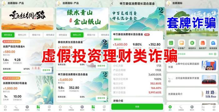 虛假理財(cái)詐騙。不法分子冒充國(guó)企“絲路基金”公司的名義,制作散布涉詐APP,虛構(gòu)推廣“綠色基金”“綠色公約”“增值計(jì)劃”“綠色建設(shè)”等高額返利理財(cái)項(xiàng)目。