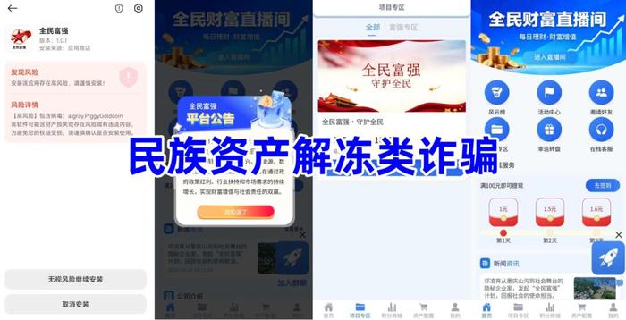 民族資產(chǎn)解凍類詐騙。不法分子冒充某知名人士的名義,打著投資“鄉(xiāng)村振興、新能源、計(jì)酬建設(shè)”等旗號(hào),制作散布涉詐APP,虛構(gòu)推廣“全民富強(qiáng)”高額理財(cái)項(xiàng)目。