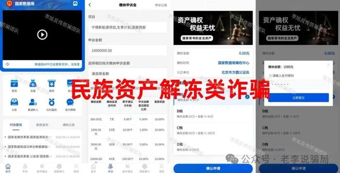 冒充“國家數(shù)據(jù)局”名義,以“資產(chǎn)確權(quán)”為噱頭,聲稱實(shí)名注冊(cè)即可領(lǐng)取“民生保障援助金”,實(shí)際通過要求提現(xiàn)時(shí)繳納“申領(lǐng)金”騙取錢財(cái)。