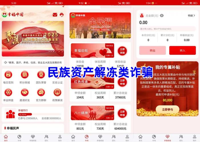 民族資產(chǎn)解凍類詐騙。不法分子冒充某部門的名義,打著領(lǐng)取“民生補(bǔ)貼”的旗號(hào),制作散布涉詐APP,參與者實(shí)名注冊(cè)可領(lǐng)取“補(bǔ)貼”,虛構(gòu)推廣“幸福起航”“紅色傳承”“八一精神”等高額返利項(xiàng)目。