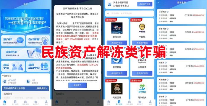 民族資產(chǎn)解凍類詐騙。不法分子打著“中國夢項(xiàng)目滯留資金確權(quán)、備案、下發(fā)”的名義,聲稱將有506萬億-1200萬億專項(xiàng)幫扶金下發(fā),引誘參與者實(shí)名注冊(cè),即可獲得 50—100 萬元下款補(bǔ)助金。