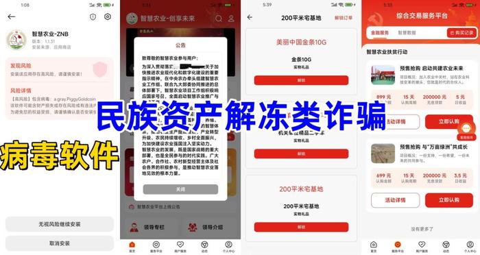 民族資產(chǎn)解凍類詐騙。不法分子冒充某部門的名義,打著推進(jìn)“鄉(xiāng)村振興、加快建設(shè)農(nóng)業(yè)”等旗號(hào),制作散布涉詐APP,推出“啟東共建農(nóng)業(yè)未來”“與萬畝綠洲共成長”高額返利項(xiàng)目,同時(shí)可獲得20萬無息貸款,發(fā)展他人實(shí)名注冊(cè)投資,可獲得固定“工資”、兌換金幣、銀幣、二手車、宅基地等。
