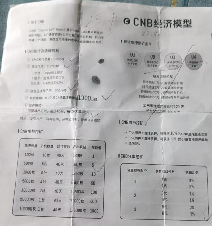 虛擬貨幣類資金盤。該項(xiàng)目宣傳是境外某公司推出區(qū)塊鏈技術(shù)的去中心化的數(shù)字資產(chǎn),發(fā)行9.3億枚CNB幣,參與者質(zhì)押可獲得礦機(jī),挖礦產(chǎn)生CNB幣獲得靜態(tài)收益,發(fā)展下線有提幣獎(jiǎng),1-6代團(tuán)隊(duì)獎(jiǎng)等。