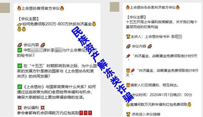 民族資產(chǎn)解凍類詐騙。不法分子冒充某部門的旗號,宣稱發(fā)放扶貧共濟(jì)基金,參與者實(shí)名注冊即可獲得200萬-800萬,要求參與者每天聽課學(xué)習(xí),元旦期間聽課有數(shù)萬元紅包獎(jiǎng)勵(lì)會(huì)議福利,涉嫌非法搜集個(gè)人信息、詐騙。