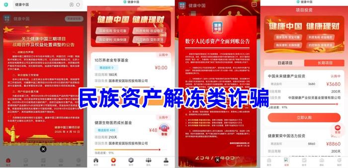 民族資產(chǎn)解凍類詐騙。不法分子冒充“國泰君安”公司的名義,聲稱是人民銀行與國泰君安合作推出“健康中國”項(xiàng)目,制作散布涉詐APP,虛構(gòu)高額返利項(xiàng)目實(shí)施詐騙。