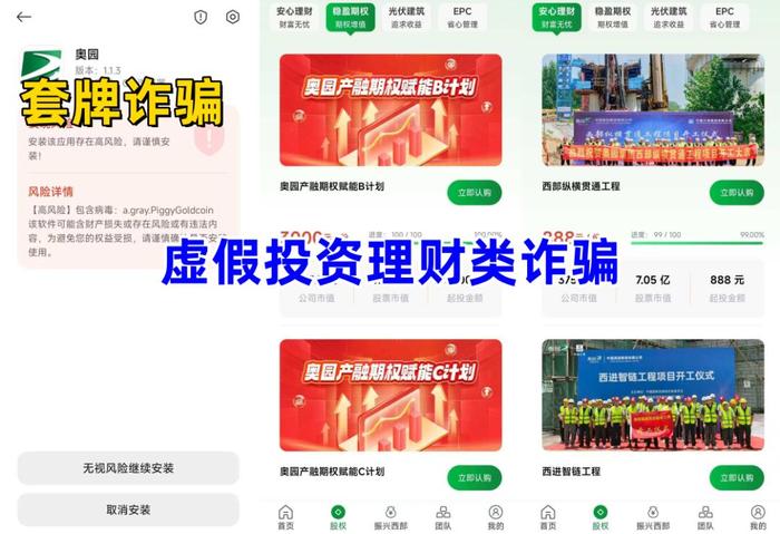近年來(lái),以“高額回報(bào)”“國(guó)家項(xiàng)目”“民生基金”為名的騙局層出不窮,詐騙手段不斷翻新。不法分子或假借知名企業(yè)、政府部門名義,或虛構(gòu)“民族資產(chǎn)解凍”“數(shù)字金融創(chuàng)新”“扶貧共富”等概念,通過(guò)制作山寨APP、構(gòu)建網(wǎng)絡(luò)資金盤等手段,層層設(shè)套,其最終目的無(wú)外乎竊取公民個(gè)人信息、騙取錢財(cái),甚至從事洗錢等違法活動(dòng)。