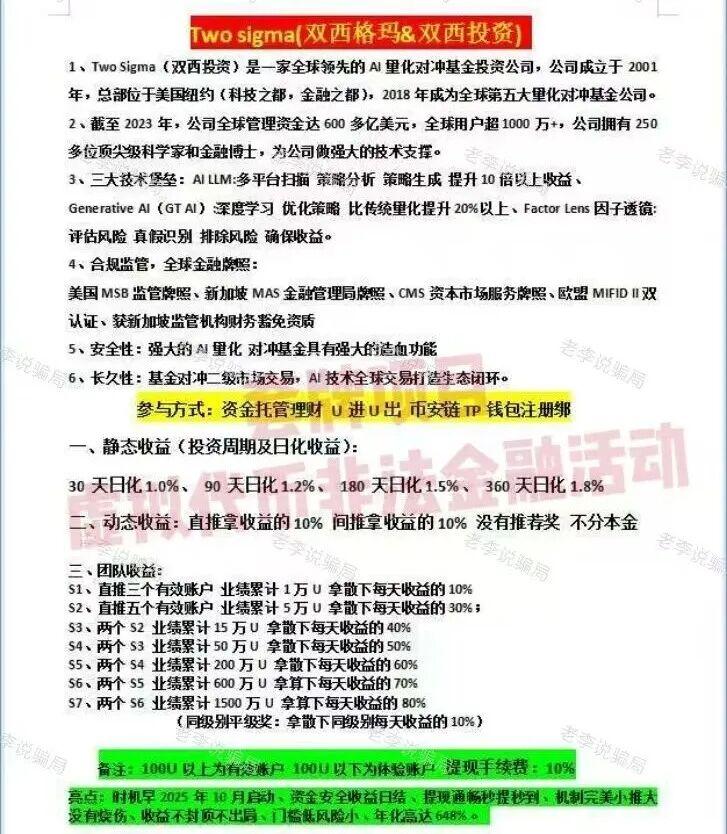 然而,真正的雙西格瑪只做機構和高凈值客戶的專業(yè)投資,從來不會面向普通個人推出高日化理財,更不會用虛擬貨幣U交易、靠錢包綁定操作。這個項目就是借著知名企業(yè)的名字裝門面,實則毫無關系。