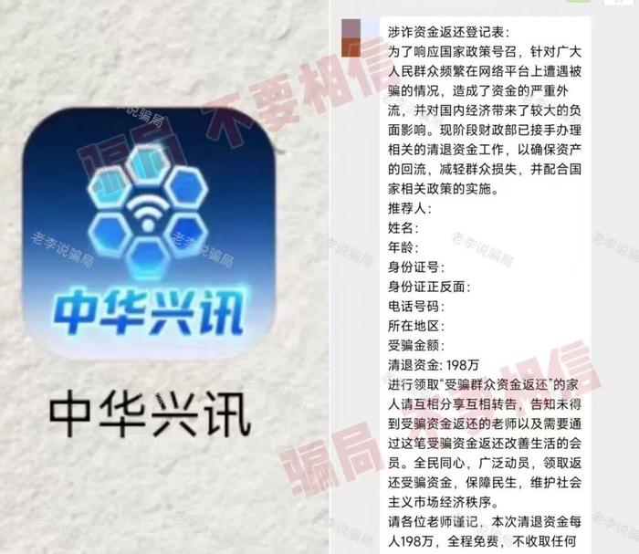 冒充“人民銀行相關人員”,以“國家扶貧補貼”“受騙資金返還”為名,通過社交群發(fā)廣告,號稱可領取198萬元高額補貼,誘導用戶填寫身份證、銀行卡、手機號等詳細信息。