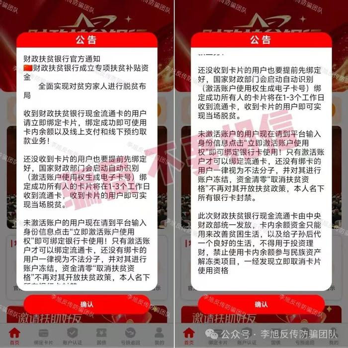冒充“國家扶貧部門”,謊稱為參與者發(fā)放扶貧金,誘導用戶繳納激活金辦理所謂的“現(xiàn)金流通卡”。