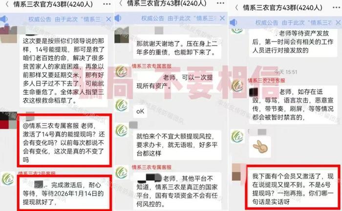 發(fā)表時(shí)間:2026-01-14 19:38作者:李旭反傳銷來(lái)源:李旭反傳防騙團(tuán)隊(duì) 最近后臺(tái)的留言和求助,看得小編心里發(fā)堵。 很多人上來(lái)第一句話就是:“老師,這個(gè)APP到底是不是真的?它說(shuō)要交一筆錢才能提現(xiàn),我已經(jīng)投進(jìn)去好幾萬(wàn)了……” 緊接著發(fā)來(lái)的,是各種光鮮亮麗的APP截圖、煞有介事的“紅頭文件”、群里熱火朝天的“收款喜報(bào)”。 可當(dāng)詳細(xì)詢問細(xì)節(jié)后,便會(huì)發(fā)現(xiàn)這些項(xiàng)目的收款賬戶大多為個(gè)人,客服的話術(shù)更是非常模板化。 更有部分承諾要“發(fā)放幾百萬(wàn)國(guó)家扶持金”或“每天穩(wěn)賺幾百收益”的官方群,突然禁言或者干脆解散了。 年關(guān)將至,這些躲在手機(jī)屏幕后的鐮刀,揮舞得比任何時(shí)候都急、都狠。它們不再滿足于讓你“投資”,而是精心設(shè)計(jì)了一個(gè)更殘酷的“臨門一腳”式收割方式。 “錢已經(jīng)押在里面,現(xiàn)在只差一步就能‘上岸‘”。 而這一步,永遠(yuǎn)需要你“再交一筆錢”。 稅費(fèi)、激活費(fèi)、認(rèn)證費(fèi)、解凍費(fèi)、印花稅、核驗(yàn)費(fèi)……名目層出不窮,但本質(zhì)只有一個(gè):在人們最渴望、最焦慮、最不甘心的時(shí)候,把最后一筆錢榨出來(lái)。 今天這些正在瘋狂“催收”、把受害者往絕路上逼的騙局,請(qǐng)你一定要耐心讀完,并轉(zhuǎn)發(fā)給身邊那些善良、焦急、可能正站在懸崖邊上的親人朋友。 畢竟,在“他們”的劇本里,可沒有什么“柳暗花明”,只有來(lái)自“深淵的凝視”! 1、“中央結(jié)算撥付”APP 冒用“中央結(jié)算公司”名義,以“結(jié)算卡”和“扶持金”為誘餌,吸引用戶實(shí)名注冊(cè)并下載。 通過承諾高額回報(bào),引導(dǎo)用戶認(rèn)購(gòu)債券、原始股等產(chǎn)品。 ![]() 近期該應(yīng)用暫停提現(xiàn),并要求用戶繳納所謂的“稅費(fèi)”。 經(jīng)查證,該APP未進(jìn)行備案,且存在安全風(fēng)險(xiǎn),與正規(guī)的“中央結(jié)算公司”無(wú)任何關(guān)聯(lián),請(qǐng)大家謹(jǐn)慎對(duì)待,避免上當(dāng)。 ![]() 2、“民生大事”APP 自去年年底以來(lái),該應(yīng)用一直對(duì)外宣稱即將“下款”,但至今未能兌現(xiàn)承諾。目前仍以“捐贈(zèng)”“手續(xù)費(fèi)”等名義向用戶收取費(fèi)用,請(qǐng)用戶注意核實(shí),避免繼續(xù)投入資金。 3、“情系三農(nóng)落地篇”APP 多次關(guān)網(wǎng)多次重啟,坑了一波又一波。近期又以“落地篇”的名義重新出現(xiàn),忽悠老用戶交300-1800元“認(rèn)證金”以激活原有資產(chǎn),試圖以此方式繼續(xù)收割。 ![]() 4、套牌的“康奈爾” 假冒境外私募機(jī)構(gòu),推廣科創(chuàng)板、可轉(zhuǎn)債等高收益項(xiàng)目。今年1月2日,該平臺(tái)突然關(guān)停,無(wú)法正常運(yùn)營(yíng)。 5、“益慈善”APP 這個(gè)APP根本未通過備案,安裝時(shí)被系統(tǒng)提示為詐騙軟件。近日正在以“確權(quán)兌付”為名,收取2580元作為所謂的“核驗(yàn)費(fèi)”。此舉涉嫌以慈善為幌子實(shí)施詐騙,請(qǐng)大家切勿輕信。 ![]() 6、“健康中國(guó)四期”APP 12月11日,“國(guó)泰君安國(guó)際”官方公眾號(hào)已發(fā)布聲明,明確指出該應(yīng)用與該公司無(wú)關(guān)。想要核實(shí)真?zhèn)蔚木W(wǎng)友可自行前往查看。詳情→ ![]() 7、套牌“匯立 Huili”APP 冒用“香港匯立銀行”名義推出虛假理財(cái)產(chǎn)品。目前已有多個(gè)團(tuán)隊(duì)負(fù)責(zé)人和群主失聯(lián),用戶無(wú)法提現(xiàn)。詳情→ 8、“青島大獅”APP 該應(yīng)用近期以“納稅”為名收取388元“印花稅”,但收款賬戶顯示為個(gè)人或第三方公司,并非正規(guī)稅務(wù)機(jī)構(gòu),存在明顯的詐騙行為,請(qǐng)用戶謹(jǐn)慎辨別。 9、“新農(nóng)服務(wù)社”APP 冒充“全國(guó)供銷合作總社”名義,謊稱國(guó)家項(xiàng)目,推出月利率超20%的虛假理財(cái)項(xiàng)目。其收款賬戶頻繁變更,為不同的第三方個(gè)人或公司。且IP地址位于境外,與正規(guī)國(guó)家項(xiàng)目特征不符,可見不實(shí)。 10、“新質(zhì)動(dòng)力”APP 該項(xiàng)目正在以“大額提現(xiàn)”為名,要求參與者繳納29997元稅金。 ![]() 11、“圓夢(mèng)錢包(圓夢(mèng)行動(dòng))”APP 冒充國(guó)家項(xiàng)目,聲稱向用戶發(fā)放338萬(wàn)元“補(bǔ)助款”,但其服務(wù)器IP設(shè)在境外。 同時(shí)以“圓夢(mèng)專屬卡”為誘餌,引導(dǎo)用戶購(gòu)買理財(cái)產(chǎn)品,近期又假借“激活大額資金”之名繼續(xù)收費(fèi),屬連環(huán)詐騙。 12、假冒的“華為穩(wěn)定幣”App 冒用“華為集團(tuán)”名義,偽造所謂“華為核算卡”,聲稱激活后可獲得382萬(wàn)元獎(jiǎng)金,并以此為由收取“個(gè)人所得稅”。 工行三門峽分行已成功攔截此類詐騙,證實(shí)所謂核算卡均為假卡!詳情→ 13、“上合共濟(jì)惠民”APP 假借“上海合作組織”名義,謊稱為用戶發(fā)放“共計(jì)基金”,吸引實(shí)名注冊(cè)。 自去年“上海合作組織會(huì)議”在天津召開后,已出現(xiàn)多款類似冒名APP,如【上合組織開發(fā)銀行APP】、【上合慈協(xié)APP】、【上合· 組織APP】等等,其中部分已爆雷,請(qǐng)用戶注意
