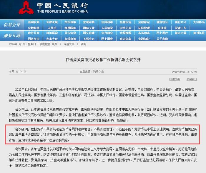 2025年11月28日,中國人民銀行召開打擊虛擬貨幣交易炒作工作協(xié)調(diào)機制會議。會議強調(diào),虛擬貨幣不具有與法定貨幣等同的法律地位,不具有法償性,不應(yīng)且不能作為貨幣在市場上流通使用,虛擬貨幣相關(guān)業(yè)務(wù)活動屬于非法金融活動。