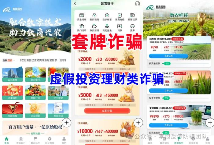 不法分子冒充“阿里巴巴”的旗號,打著“數(shù)字農(nóng)業(yè)”的名義,虛構(gòu)“數(shù)農(nóng)銀行”“數(shù)農(nóng)標桿”等高額理財項目。