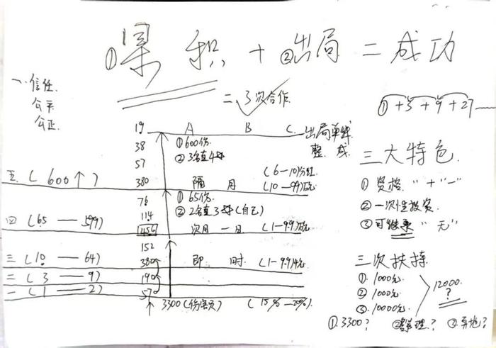 這是傳銷組織最核心的誘餌。他們宣稱投入53340元,發(fā)展3人到“出局”,最高可獲利800萬,單線發(fā)展也能拿到273萬。為了讓謊言顯得真實,他們設(shè)計了復(fù)雜的層級制度:分三星(2崗位)、四星(3崗位)、五星(4崗位),每個崗位對應(yīng)不同的收益系數(shù)(如三星1崗380元、五星1崗380元等),宣稱“份額累計疊加,只加不減”,工資按“新增份額×崗位系數(shù)”計算,還編造“邀約人會墊付20萬助你上五星”的承諾,讓受害者覺得“收益明確、風(fēng)險極低”。