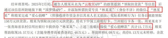 2025年2月,57歲的殷某在名為“云數(shù)貿(mào)APP”的群內(nèi)看到“領(lǐng)取扶貧款”信息,隨后通過鏈接下載了“國夢情APP”,并添加所謂“扶貧專員”林某某(疑似境外詐騙人員)的微信。對方聲稱,只要完成“愛心捐贈”任務(wù)(實(shí)為接收涉詐資金并轉(zhuǎn)出),即可領(lǐng)取150萬元扶貧款。