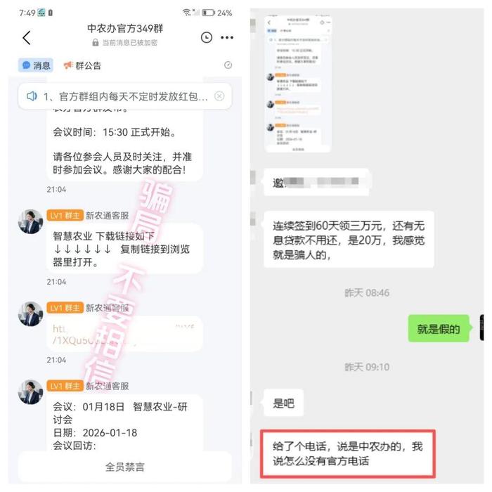 冒充“中農(nóng)辦”名義,宣稱“連續(xù)簽到60天可領(lǐng)3萬元現(xiàn)金,還能申請20萬無息貸款(無需償還)”,吸引大量希望“輕松獲利”的參與者。前期讓參與者在App上簽到、做任務(wù),積累一堆毫無價值的“虛擬積分”“虛擬資產(chǎn)”,營造“即將兌現(xiàn)福利”的假象。