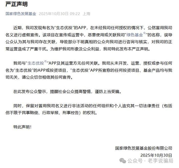 2025年10月30日,國家綠色發(fā)展基金股份有限公司發(fā)布嚴(yán)正聲明,稱與“生態(tài)優(yōu)投”APP及其運(yùn)營方無任何關(guān)聯(lián)。國家綠色發(fā)展基金股份有限公司也未開發(fā)、運(yùn)營、授權(quán)或參與任何名為“生態(tài)優(yōu)投”的APP或投資項(xiàng)目。