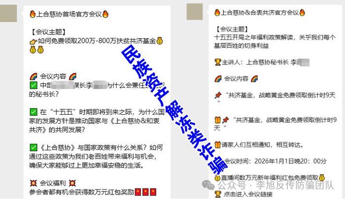 發(fā)表時(shí)間:2026-01-22 18:09作者:李旭反傳銷(xiāo)來(lái)源:李旭反傳防騙團(tuán)隊(duì) 近日,一位網(wǎng)友的留言讓我們深有感觸:“十多年前就看過(guò)您的博客,沒(méi)想到還戰(zhàn)斗在第一線(xiàn)?!彼锌?,十多年前朋友陷入傳銷(xiāo),如今自己的愛(ài)人又遇到了。 ![]() ![]() ![]() △2006年,李旭老師離開(kāi)傳銷(xiāo)之后,便走上了反傳銷(xiāo)這條路,在博客發(fā)表“傳銷(xiāo)——我心中永遠(yuǎn)的痛”連載短文,現(xiàn)如今在網(wǎng)上依舊可以看到。 作為李旭反傳防騙團(tuán)隊(duì)的一員,看到這則留言,小編既感動(dòng),也警醒。感動(dòng)于李旭老師二十年如一日的堅(jiān)守;警醒于時(shí)至今日,仍有許多人誤以為“傳銷(xiāo)已是過(guò)去式”,或以為只有限制人身自由、關(guān)小黑屋的才是傳銷(xiāo)。 甚至?xí)r常有人“反諷”:“你們自稱(chēng)反傳20年,怎么傳銷(xiāo)還有?”殊不知,傳銷(xiāo)與詐騙一樣,從未消失,只是在不斷“升級(jí)換代”、改頭換面。它們變得更隱蔽、更狡猾,也更具有欺騙性。 一、傳銷(xiāo)的“進(jìn)化”:從“暴力控制”到“精準(zhǔn)獵殺” 【早年傳銷(xiāo):顯性暴力,一眼可辨】 核心邏輯:物理拘禁+強(qiáng)制洗腦,靠暴力實(shí)現(xiàn)斂財(cái),特征直白易懂: 人身控制極端:沒(méi)收手機(jī)、身份證,封閉式集體住宿,拒絕加入即面臨威脅脅迫; 洗腦方式粗放:線(xiàn)下集中上課、喊口號(hào),主打“拉人頭賺提成”,無(wú)實(shí)際產(chǎn)品; 模式簡(jiǎn)單粗暴:層級(jí)少、返利規(guī)則直白,靠“收入門(mén)費(fèi)”盈利,聚集在城郊隱蔽窩點(diǎn); 目標(biāo)人群寬泛:瞄準(zhǔn)無(wú)業(yè)者、應(yīng)屆生等社會(huì)經(jīng)驗(yàn)不足者,以“找工作、見(jiàn)朋友”異地邀約。 【現(xiàn)在傳銷(xiāo):隱性精神控制,防不勝防】 核心邏輯:精神PUA+合法偽裝,放棄暴力卻更致命,特征高度隱蔽: 精神控制為主:不限制自由,卻通過(guò)情感聯(lián)結(jié)、創(chuàng)業(yè)夢(mèng)想等話(huà)術(shù),讓人“自愿”投入并拉攏親友。 馬甲多樣:披著區(qū)塊鏈、養(yǎng)老康養(yǎng)、分享經(jīng)濟(jì)、跨境電商等“高大上”外衣,偽造資質(zhì); 洗腦精準(zhǔn):一對(duì)一溝通、線(xiàn)上社群分享、編造“成功案例”,綁定親情或創(chuàng)業(yè)夢(mèng); 線(xiàn)上線(xiàn)下聯(lián)動(dòng):社交平臺(tái)引流+小型招商會(huì)洗腦,用“團(tuán)隊(duì)獎(jiǎng)”“業(yè)績(jī)獎(jiǎng)”掩蓋拉人頭本質(zhì); 標(biāo)的虛擬:無(wú)實(shí)體商品或價(jià)值虛高,以虛擬幣、積分、股權(quán)為斂財(cái)工具,提現(xiàn)設(shè)障; 精準(zhǔn)收割:針對(duì)寶媽、老人、創(chuàng)業(yè)者定制話(huà)術(shù),比如向老人推“養(yǎng)老投資”; 裂變極快:依托熟人關(guān)系鏈傳播,跨地域無(wú)邊界,查處難度翻倍。 二、詐騙的“變身”:從街頭騙術(shù)到網(wǎng)絡(luò)黑產(chǎn) 早年的詐騙多為線(xiàn)下接觸: 手法傳統(tǒng):如“丟包分錢(qián)”“假冒神醫(yī)”“假寶物詐騙”等,依賴(lài)演技和口才,主要以線(xiàn)下面對(duì)面作案為主。 范圍有限:往往針對(duì)局部地區(qū)的中老年人或流動(dòng)人口,利用信息差與人性弱點(diǎn)。 現(xiàn)在的詐騙已全面轉(zhuǎn)向網(wǎng)絡(luò): 技術(shù)化、產(chǎn)業(yè)化:運(yùn)用大數(shù)據(jù)、AI換聲擬像、涉詐APP等,形成跨境犯罪鏈條。 手段多樣:“刷單返利”“殺豬盤(pán)”“冒充公檢法”“虛假投資理財(cái)”等遠(yuǎn)程詐騙成為主流。 全網(wǎng)覆蓋:目標(biāo)覆蓋所有網(wǎng)民,瞬間可達(dá)全國(guó)各地,隱蔽性強(qiáng)、危害面廣。 核心轉(zhuǎn)變是從“人對(duì)人的街頭戲法”演變?yōu)椤凹夹g(shù)驅(qū)動(dòng)的高科技犯罪”,防范難度顯著增加。 近日,我們根據(jù)近期大量咨詢(xún)與反饋,梳理出以下15個(gè)高危騙局與傳銷(xiāo)項(xiàng)目,請(qǐng)大家提高警惕,切勿參與: 1. 虛構(gòu)的“益慈善”App 冒充“財(cái)政部”名義,謊稱(chēng)將為完成“愛(ài)華捐助”的“追夢(mèng)人”發(fā)放補(bǔ)貼,以此斂財(cái)。經(jīng)核查,該APP未完成備案手續(xù),已被手機(jī)安全系統(tǒng)標(biāo)注為詐騙應(yīng)用并禁止安裝。 2. 虛構(gòu)的“全民化債”App 以“國(guó)家項(xiàng)目,可幫助化解債務(wù)”為噱頭,誘導(dǎo)不明真相的中老年下載注冊(cè),宣稱(chēng)注冊(cè)就給“股金”,還設(shè)置傳銷(xiāo)式推廣模式。 目前該項(xiàng)目還處于發(fā)展階段,后期就將以手續(xù)費(fèi)或誘導(dǎo)“投資”,讓參與者債務(wù)未解,又添新債。遠(yuǎn)離! 3. 虛構(gòu)的“共信中華”App 也是一個(gè)打著“國(guó)家項(xiàng)目”旗號(hào)的民族資產(chǎn)解凍詐騙項(xiàng)目,宣稱(chēng)“負(fù)債多、征信不好的,上面都可幫助平債并恢復(fù)征信,還可申請(qǐng)創(chuàng)業(yè)金和消費(fèi)金......”,就是把秦皇島中綠平債傳銷(xiāo)組織那一套說(shuō)辭又搬到網(wǎng)上。實(shí)則就是為了讓參與者提供身份信息辦理虛假的銀行卡進(jìn)行詐騙!一定要遠(yuǎn)離,小心涉嫌“幫信罪”。 4.虛構(gòu)的“上合慈協(xié)”App 不法分子冒充某部門(mén)的旗號(hào),宣稱(chēng)發(fā)放扶貧共濟(jì)基金,參與者實(shí)名注冊(cè)即可獲得200萬(wàn)-800