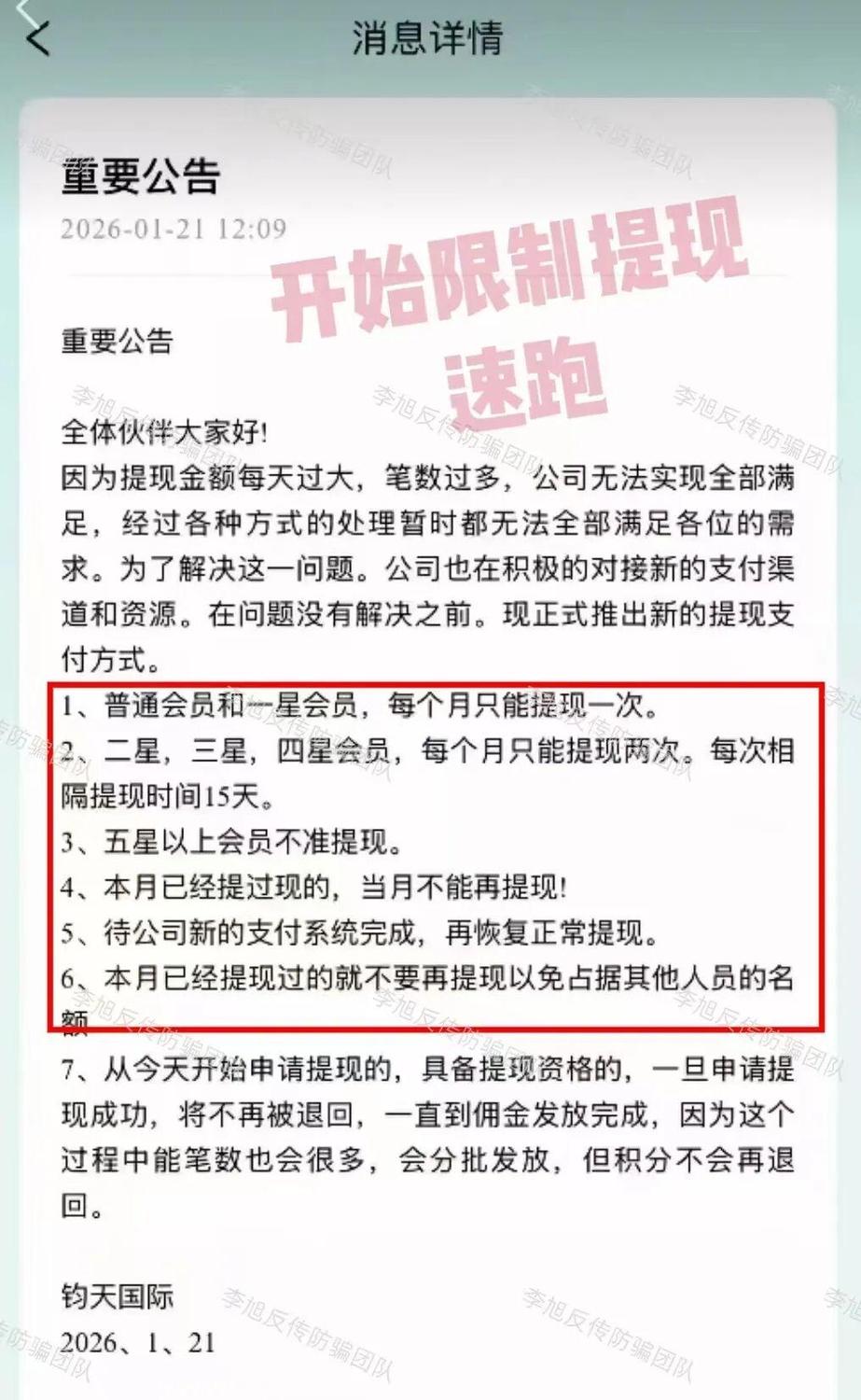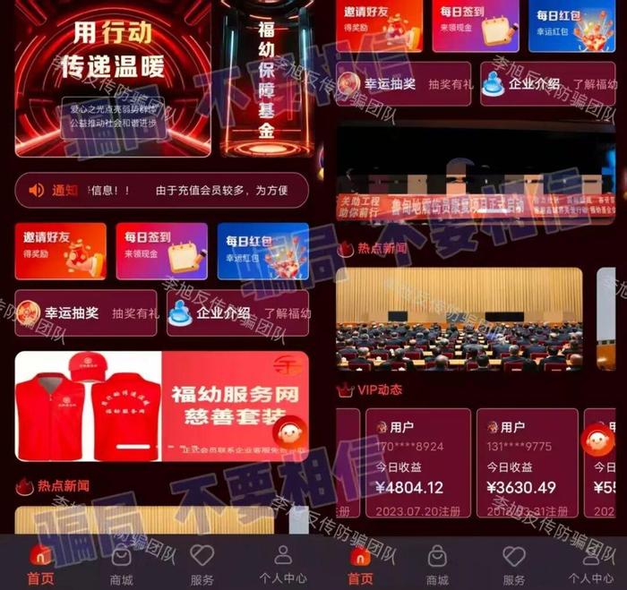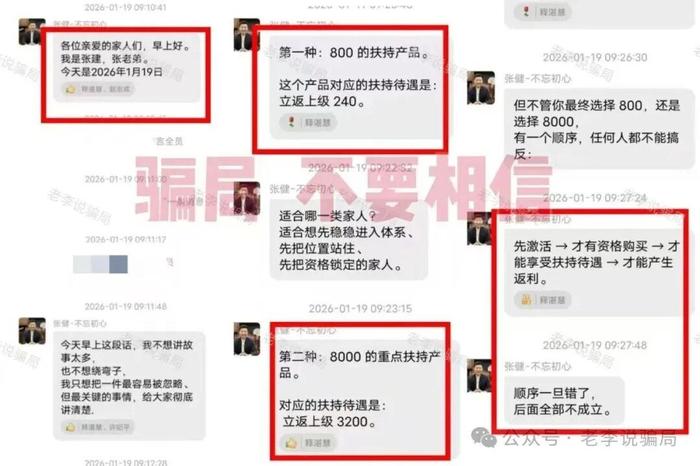 發(fā)表時間:2026-01-23 19:22作者:李旭反傳銷來源:李旭反傳防騙團(tuán)隊(duì) 最近不少平臺開始出現(xiàn)相似的動靜。 提現(xiàn)忽然變得拖延,各種之前沒聽說的“手續(xù)費(fèi)”、“審核費(fèi)”冒了出來,或者拉人頭的獎勵突然加碼,每一個都還催得特別急。 這通常不是什么好信號。其實(shí)這些項(xiàng)目仔細(xì)看的話,套路都差不多。無非是打著官方或“高科技”概念,用高得離譜的承諾鼓勵用戶拉朋友進(jìn)來。 但是錢都是匯給個人或八竿子打不著的公司賬戶。APP本身更是來路不明、獎勵看得見卻摸不著。是真是假答案早就擺在那里。只不過,當(dāng)人被高回報(bào)的預(yù)期推著走時,常常會選擇性地忽略它們。而某些騙局又會像鎖定目標(biāo)一樣,反復(fù)針對同一群人。 比如“云數(shù)貿(mào)”“智天”這兩個快被用爛的名頭,隔段時間就換個“項(xiàng)目重啟”、“回歸”的口號重新出現(xiàn),吸引那批曾經(jīng)接觸過、或許還抱有執(zhí)念的所謂“家人”。 利用人們不甘心的心理,把過去的信任甚至損失,轉(zhuǎn)化成新一輪投入的理由。看似是給機(jī)會,實(shí)質(zhì)是把人拉進(jìn)更深的循環(huán)里。 如果一個項(xiàng)目的重心突然變成追加“投資”或者加大“拉新”回報(bào),甚至在提現(xiàn)環(huán)節(jié)設(shè)置障礙,都需要格外警惕。 今天的這些項(xiàng)目都帶著相同的特點(diǎn),如果遇到,請立刻遠(yuǎn)離!如發(fā)現(xiàn)自己或身邊人參與的項(xiàng)目也有類似情況,可在評論區(qū)留言! 請一定牢記,當(dāng)您覺得某個環(huán)節(jié)越來越不對勁,一定要停下來重新審視,或許就能避開那最后一撥收割。 1、“新農(nóng)服務(wù)社”APP 冒充“全國供銷合作總社”,宣傳所謂“鄉(xiāng)村振興理財(cái)”,承諾的月收益率超過20%。 實(shí)際上,其收款賬戶頻繁更換,均為不同的個人或空殼公司,APP本身未通過且IP在境外。 目前它正以“提現(xiàn)需交1%審核費(fèi)”為由進(jìn)行最后收割,金額從數(shù)千至十幾萬元不等。 這已經(jīng)是非常明顯的收網(wǎng)信號,請盡早遠(yuǎn)離,避免擴(kuò)大損失。 ![]() 2、“智能中國”APP 打著“打造數(shù)字中國、智能中國建設(shè)”的名義,虛構(gòu)推廣各種根本不存在的高息理財(cái)項(xiàng)目。設(shè)置各種十分豐厚的高額獎勵刺激參與者拉新。 為規(guī)避監(jiān)控,平臺甚至開發(fā)了專用聊天軟件“智能通”用于會員溝通。 據(jù)參與者反饋,目前這個項(xiàng)目已經(jīng)禁止提現(xiàn),疑似收網(wǎng)在即。 ![]() 3、“與健同行”APP “云數(shù)貿(mào)”系列騙局變種。利用“350萬圓夢金”吸引參與者實(shí)名注冊加入,邀約新人還有更多獎勵。 目前看似還沒有收費(fèi)項(xiàng)目,但這樣做的主要目的是零成本獲取大眾詳細(xì)個人信息,用于后續(xù)精準(zhǔn)詐騙或轉(zhuǎn)賣。 4、“云夢計(jì)劃”APP 和“與健同行”APP類似,同樣打著“張健”旗號,抓住人不甘心的心理,專騙原來那批“云家人”。 以“項(xiàng)目重啟”要求用戶填寫個人信息并繳納800或8000元“激活費(fèi)”。這實(shí)則是針對同一人群的再度收割,所謂“重啟”從來都是騙局。 ![]() 5、“健享銀行”APP 偽造不存在的“健享銀行”,以高額分紅誘騙用戶成為“股東”。 但所有“投資款”全部進(jìn)入到了不同的個人賬戶。 沒有任何正規(guī)銀行會使用個人賬戶接收股權(quán)款,如此明顯的漏洞卻因?yàn)閰⑴c者對“張健”的盲目“信任”而被忽視。 6、“鈞天國際”APP 自“雙合元界”因傳銷被罰后更名“鈞天國際”繼續(xù)忽悠。 近日該平臺以“系統(tǒng)異?!睘橛桑_始按等級限制用戶提現(xiàn)。 小編提示,提現(xiàn)受阻往往是一個項(xiàng)目接近尾聲的重要信號之一,切勿再心存幻想! ![]() 7、“FuYou福幼”APP 冒充慈善機(jī)構(gòu),以“代還貸款”為向用戶推廣“車貸專區(qū)”“醫(yī)療貸專區(qū)”“創(chuàng)業(yè)扶貧貸專區(qū)”等高額理財(cái)項(xiàng)目。 這個軟件并未通過備案,只能通過網(wǎng)址鏈接下載,充值收款賬戶也是不同的第三方個人、公司賬號,并非對公賬戶。 真正慈善項(xiàng)目從不與高息理財(cái)捆綁,更不會使用個人賬戶收款。 ![]() 8、“【十五五】開局之年”APP “中信集團(tuán)”APP崩盤后搖身一變,蹭“十五五規(guī)劃”熱度推出新的騙局項(xiàng)目。 APP下載提示未備案且存在高風(fēng)險(xiǎn)。 宣稱注冊即送的高額資金不過只是后臺無法提現(xiàn)的數(shù)字,目的就是后期以“激活”“退稅”等名義忽悠用戶繳費(fèi)。 9、"全民脫貧”APP 冒充“扶貧部門辦”,打著“愛華捐助”活動名義,聲稱注冊即可領(lǐng)取1000萬扶貧補(bǔ)貼,要求參與者“捐贈”。 ![]() 平臺通過大量虛假制作的提現(xiàn)成功憑證、政策講解視頻博取信任。但APP未通過備案,下載提示高風(fēng)險(xiǎn)被禁止安裝,IP地址在境外,可見所謂的“財(cái)政部牽頭”、“捐贈”純屬自導(dǎo)自演的劇本。 ![]() 10、“智天資本”APP 利用 AI 數(shù)字人冒充 “鄧智天”,宣稱注冊送 “天璽股權(quán)”“智天幣”,推出 “住房公積金”“股東補(bǔ)貼” 等理財(cái)項(xiàng)目。最近正在利用“股權(quán)代碼”、“股權(quán)證明”等吸引新人。 去年4月工信部反詐專班公眾