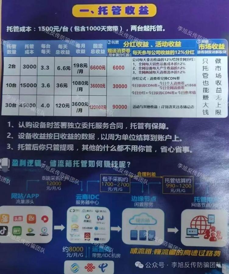 該項(xiàng)目宣稱用戶購(gòu)買其“儲(chǔ)流箱”硬件設(shè)備后,可利用家庭閑置帶寬貢獻(xiàn)數(shù)據(jù),通過(guò)銷售CDN數(shù)據(jù)包獲利,并許諾極具吸引力的投資回報(bào)率。