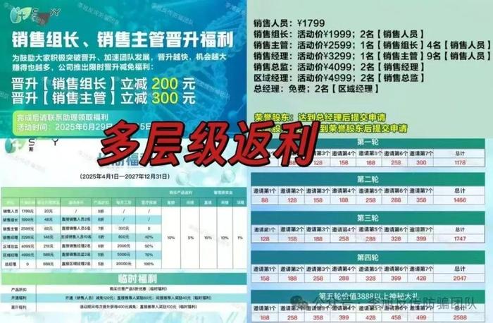 以“大健康產(chǎn)業(yè)”為幌子,要求參與者繳納1799元—數(shù)千元不等的“入門費(fèi)” 獲取代理身份; 以“拉人頭”為核心,代理晉升和收益完全依賴發(fā)展下線的數(shù)量,而非實(shí)際產(chǎn)品銷售;構(gòu)建金字塔式層級(jí)計(jì)酬體系,從銷售人員到總經(jīng)理共7級(jí),上級(jí)通過(guò)下級(jí)的入門費(fèi)、層級(jí)晉升獲利。