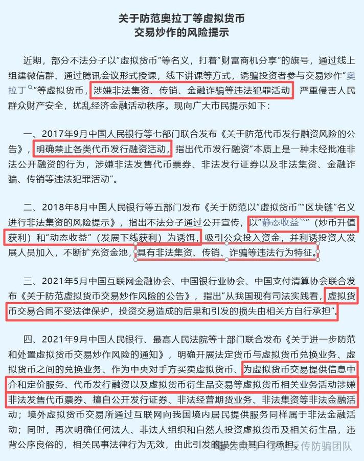 2025年8月,“歐潭融媒”微信公眾號發(fā)布《關(guān)于防范奧拉丁等虛擬貨幣交易炒作的風(fēng)險提示》。提示中明確提到:不法分子以“虛擬貨幣”等名義,通過各種方式,誘騙投資者參與交易炒作“奧拉丁”等虛擬貨幣,涉嫌非法集資、傳銷、金融詐騙等違法犯罪活動。(點擊↓下圖查看全文)